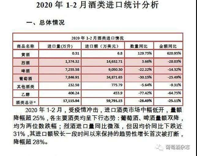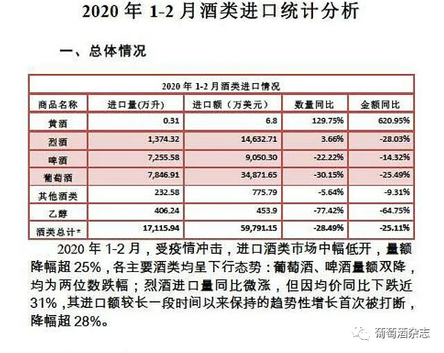 根据《2020年1-2月酒类进口统计分析》数据显示,2020年进口酒类市场开局受挫,量额降幅超25%,各主要酒类均呈下降趋势,其中葡萄酒量额双降。