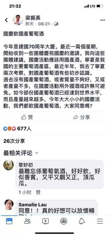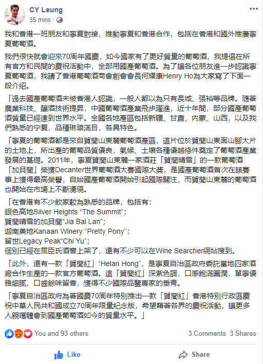 全国政协副主席梁振英4月底带队50人香港经贸代表团来宁夏考察,高度认可宁夏贺兰山东麓战略化大单品发展模式,并给予了“贺兰红”品牌高度关注与支持,提出了“国人喝国酒”的口号,他甚至后来在自己的社交平台上号召:中国人应该以国庆70周年为契机,所有的庆祝活动都应该喝国产葡萄酒。