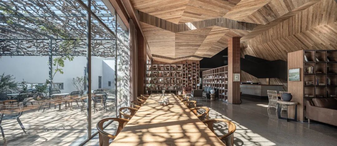 In terms of indoor treatment, it is more "sustainable" oriented. A large number of Helan Mountain stones enter the space in the original shape, forming the internal landscape. The terrazzo processed and polished by Helan Mountain stone can be seen everywhere in the space, exuding a warm and delicate temperament. In addition to making the doors waiting to be reconstructed by light and shadow, the recyclable insect-eroded teak also constructs the top structure of the reading area, responding to the rolling Helan Mountain. The soft cloth dyed by plants, the door handle made of dried grapevine and the simple old objects, all these things constitute the daily mood of the inner space of the Xige Estate.
